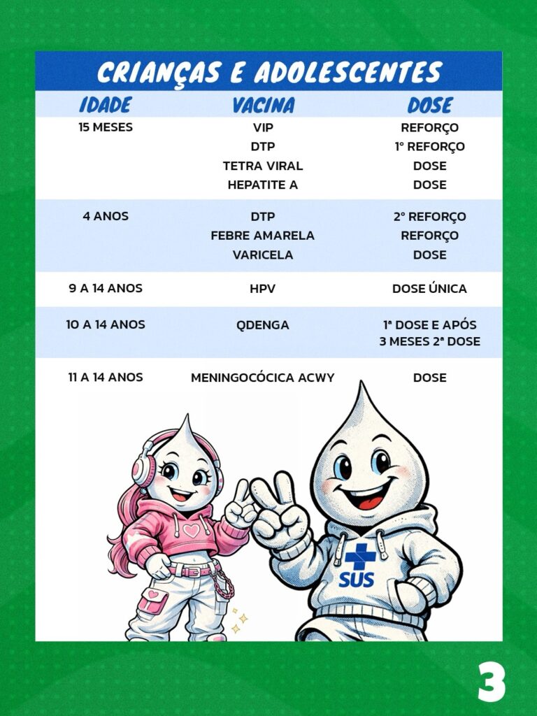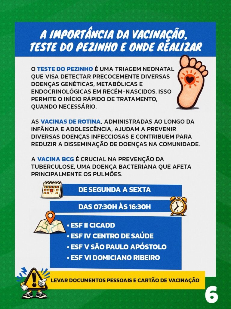 Com ele, você poderá se orientar de forma prática sobre a vacinação de rotina para crianças, adolescentes, adultos, idosos, gestantes e trabalhadores da saúde, além de acompanhar as campanhas de vacinação e informações sobre o Teste do Pezinho. 🙏