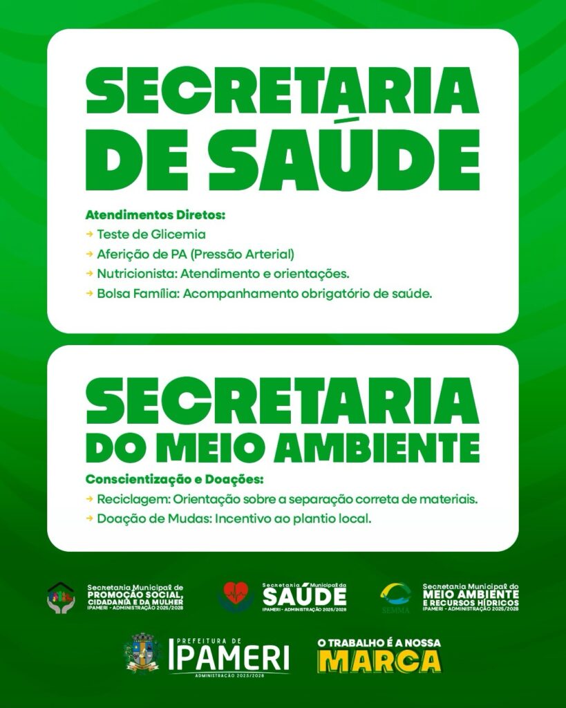 A Prefeitura de Ipameri, por meio da Secretaria de Promoção Social, realizará no dia 28 de janeiro, das 8h às 12h, na Quadra Poliesportiva – Setor Central (em frente à unidade do SAMU), a primeira edição do Itinerante do Bem do ano, levando serviços, cuidado e cidadania à comunidade de Domiciano Ribeiro. 🙌