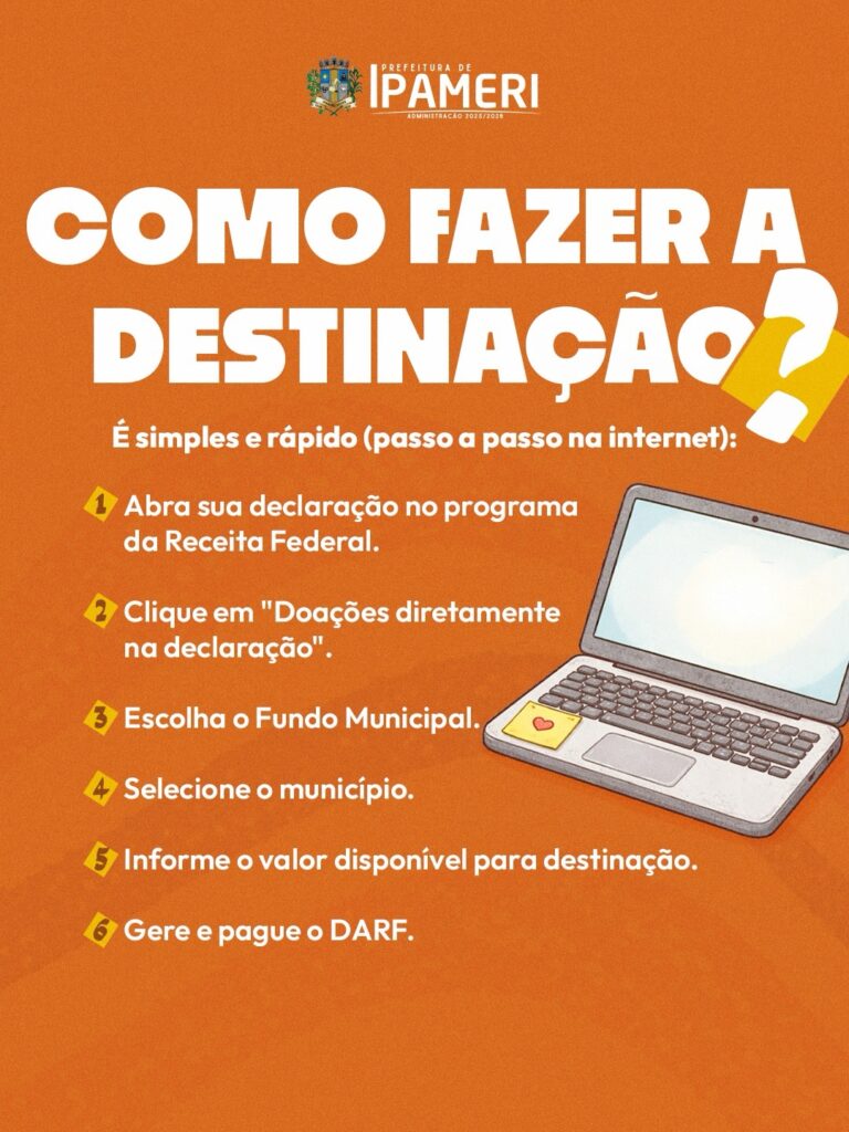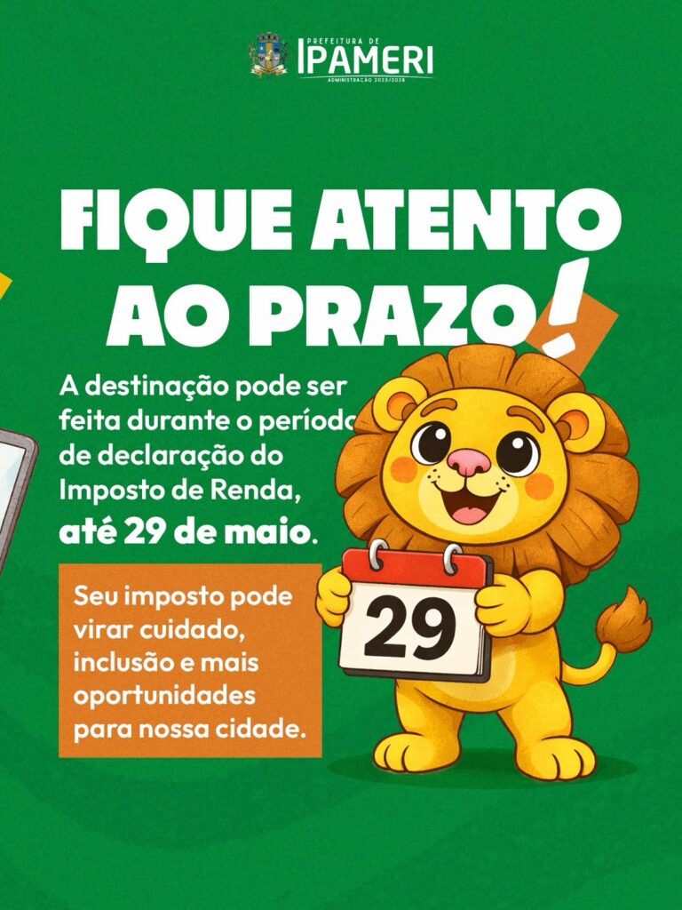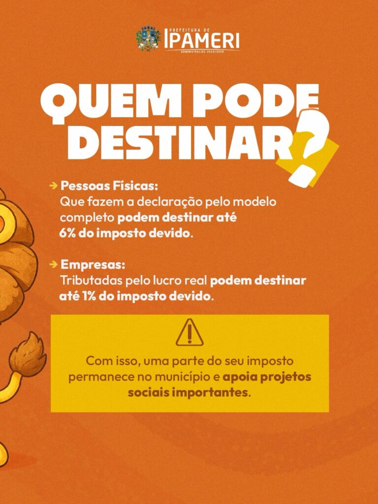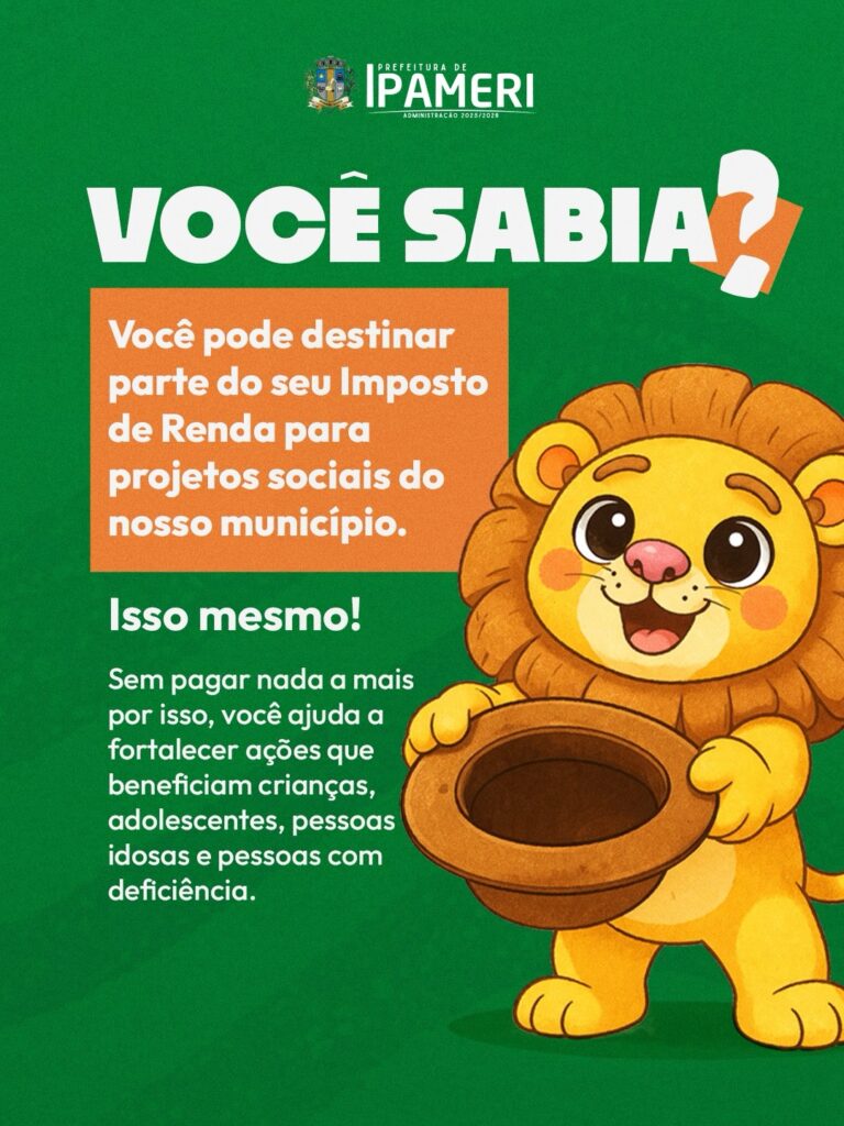 Ao preencher sua declaração, destine parte do seu Imposto de Renda para os Fundos Municipais da Criança e do Adolescente e da Pessoa Idosa de Ipameri. Essa ação fortalece nossas causas sociais e apoia instituições filantrópicas que cuidam de quem mais precisa. ![]()